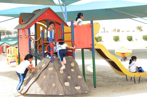 The architectural style of Shaikha Hessa Girls’ School boasts state-of-the-art facilities with a central dome connecting three wings – the Administration, Elementary and Middle/High school wings. The dome serves as an all-purpose meeting place for the students. The Elementary building houses a Computer laboratory, Science laboratory, and a Home Economics laboratory, in addition to ten classrooms, an Arabic library and the office of the social counselor. The Administration building houses the Principal, Deputy Principal, Finance, Registration/Admissions, Board Room and a Professional Development room. Next to the central building is a separate Kindergarten building with a large activities hall, spacious classrooms and its own playground. On the other side of the central building is the cafeteria and separate Multi-Purpose Hall that includes Physical Education facilities and a professional stage, curtain, with audio and light technology. Adjacent to the Multi-Purpose Hall is a shaded swimming pool.
